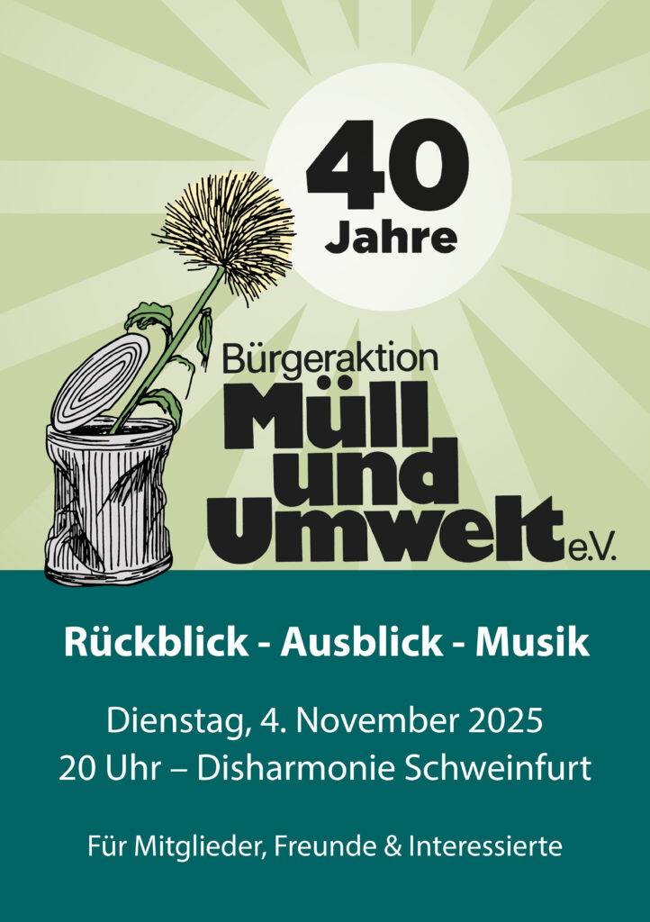 Die Bürgeraktion „Müll und Umwelt e.V.“ feiert in diesem Jahr ihr 40-jähriges Bestehen und lädt dazu alle Mitglieder, Freundinnen und Freunde sowie interessierte Bürgerinnen und Bürger am Dienstag, den 4. November, in die Disharmonie nach Schweinfurt ein. Wir starten mit der Jahreshauptversammlung für unsere Mitglieder um 19:00 Uhr. Ab 20:00 Uhr im öffentlichen Teil gibt es einen Rückblick mit musikalischer Begleitung über die vielen Aktionen und Erlebnisse des Umweltvereins in den letzten Jahrzehnten. Aber auch der Ausblick und die Information über aktuelle Themenfelder liegen der Bürgeraktion am Herzen, verbunden mit dem Wunsch auf die weitere Unterstützung durch bestehende oder neue Mitglieder. An dem Abend wird es auch ein Imbiss-Angebot geben sowie genügend Zeit für nette Gespräche in gemütlicher Runde. Hier weiterlesen mit Informationen zu unseren Anfängen und jetzigen Aktivitäten.
